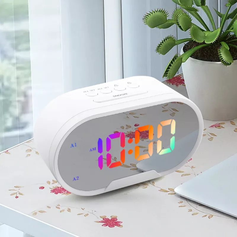 Дигитални стони и стони дигитални 5,5-инчни ЛЕД стони огледало РГБ будилник 12 24-часовни РГБ дисплеј 2 функција аларма и одлагања за студенте кућне канцеларије који користе, сат са ноћним светлом украшава вашу удобну спаваћу собу. Огледални будилник са два УСБ излаза за пуњење телефона.